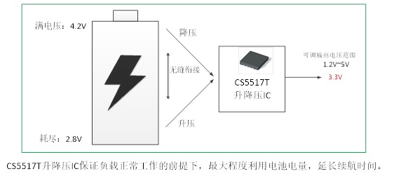 例如要得到5V電壓,必須得用升壓芯片了。但3.3V、3.6V兩種電壓,是否可以直接由鋰電池經(jīng)過降壓芯片來實現(xiàn)呢?假設(shè)要使一個典型電壓范圍為2.8V到4.2V的鋰電池提供3.3V的輸出電壓,如果使用降壓轉(zhuǎn)換器,那么電池的截止電壓必須大于3.3V,無法有效利用電池中存儲的電能。而降壓-升壓轉(zhuǎn)換芯片有助于充分利用電池的所有電能,因為當(dāng)輸入電壓等于或低于3.3V時,降壓-升壓轉(zhuǎn)換芯片還可以保證負載正常工作,最大程度消耗電池存儲的電能。如下圖所示: