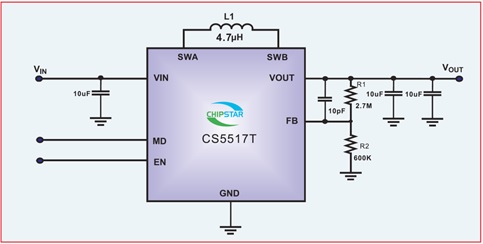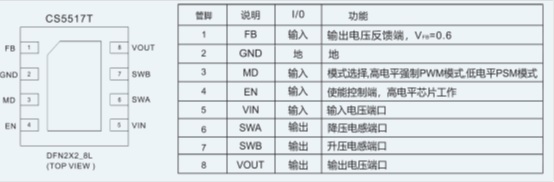 CS5517T是一款超微小型、超低功耗,高效率,升降壓一體DC-DC調(diào)整器.適用于雙節(jié),三節(jié)干電池或者單節(jié)鋰電池的應(yīng)用場景.可以有效的延長電池的使用時間。CS5517T由電流模PWM控制環(huán)路,誤差放大器,比較器和功率開關(guān)等模塊組成。該芯片可在較寬負載范圍內(nèi)高效穩(wěn)定的工作。CS5517T的輸入電壓為1.8V至5.0V提供可調(diào)輸出電壓為(1.2V至5V)。在輸出電壓為3.3V的情況下,輸入從2.7V到4.4V,它能提供最大600mA的電流負載 . CS5517T可以通過調(diào)整兩個外加電阻來設(shè)定輸出電壓。CS5517T提供了纖小的DFN2X2_8L封裝形式 可供客戶選擇 ,其額定的工作溫度范圍為-40℃至85℃。