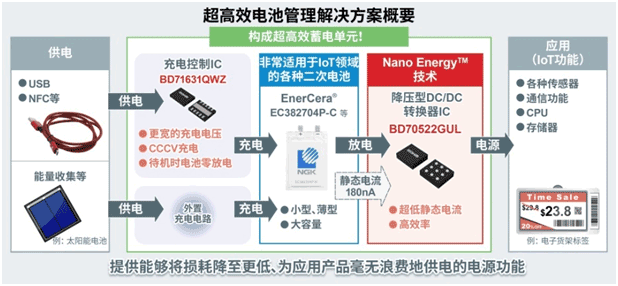 在本解決方案中,搭載超低靜態(tài)電流技術“Nano Energy™”的電源IC可以更大程度地降低應用產品電源部分的功耗,同時,支持各種二次電池的充電控制IC可為各種二次電池提供相匹配的充電。