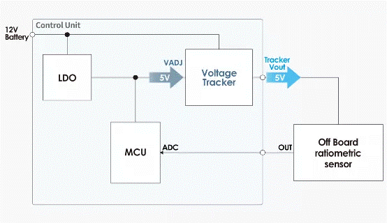 ECU(電子控制單元)的分離式傳感器供電并準(zhǔn)確讀取信號時,電壓跟蹤器是最好的選擇,原因在于其卓越的電壓跟蹤精度。這一點將會在「3.