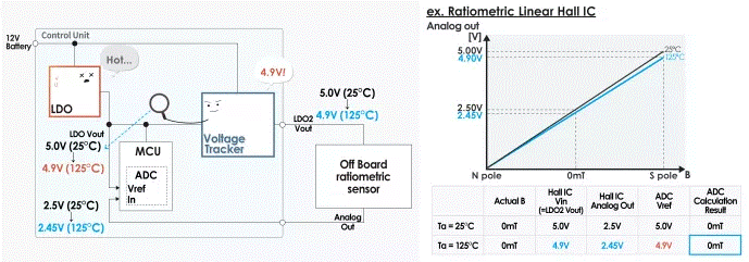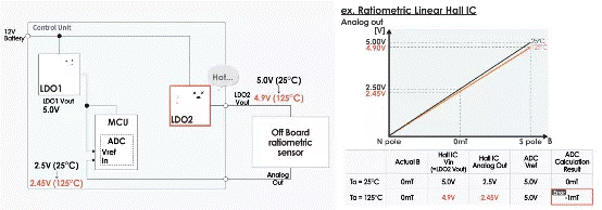 Out)穩(wěn)壓器為分離式傳感器供電時,與使用電壓跟蹤器相比,對分離式傳感器(Ratiometric Linear Hall IC)讀數(shù)精度的影響。