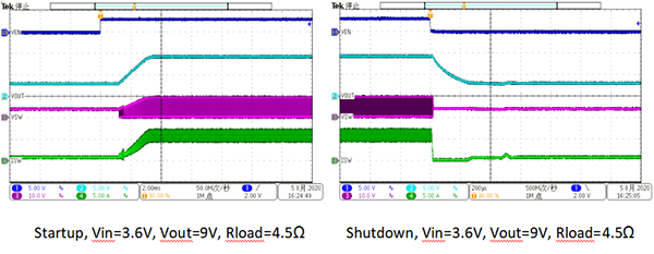 Startup, Vin=3.6V, Vout=9V, Rload=4.5Ω Shutdown, Vin=3.6V, Vout=9V, Rload=4.5Ω