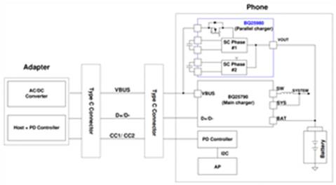 在BQ25980的實(shí)際應(yīng)用中,如圖一所示,通常需要搭配使用傳統(tǒng)的電感型充電芯片(如BQ2579x系列),組成主、副配合的快速充電系統(tǒng)。其中,作為主充電芯片的BQ2579x負(fù)責(zé)完成充電協(xié)議的基本檢測、電池的預(yù)充電、涓流充電與截止充電等階段,并結(jié)合電源路徑管理功能為系統(tǒng)負(fù)載提供穩(wěn)定的供電;而作為副充芯片的BQ25980負(fù)責(zé)在電池的恒流充電、恒壓充電等階段實(shí)現(xiàn)高效率、大功率的快速充電。