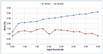 系統(tǒng)上電后,參考文檔“BQ25980EVM (BMS040) Evaluation Module User Guide”的說明將BQ25980配置為開關(guān)電容型充電模式后,逐漸調(diào)整程控電源的直流電壓,觀察記錄萬用表上測量得到的輸入電流讀數(shù);同時(shí),使能BQ25980的ADC功能,觀察0x25h寄存器(IBUS_ADC)和0x31h寄存器(IBAT_ADC)的取值及其對(duì)應(yīng)電流值讀數(shù)的變化;實(shí)驗(yàn)重復(fù)共計(jì)三次,取平均值并整理記錄如下表所示。其中,I_IN為萬用表測得的電流讀數(shù),I_Read1為IBUS_ADC測得的電流讀數(shù),I_Read2為IBAT_ADC測得的電流讀數(shù);Error1和Error2分別為I_Read1和I_Read2偏離I_IN值的相對(duì)誤差。