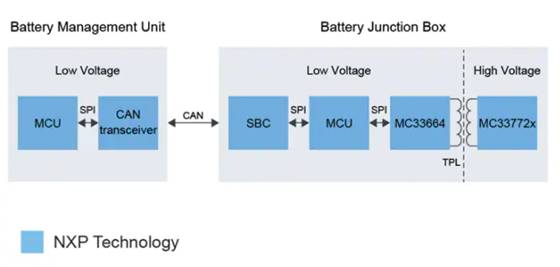 高壓系統(tǒng)通信的一個(gè)挑戰(zhàn)是將低壓半導(dǎo)體 (12 V) 與高壓 (400 V) 電池側(cè)隔離開(kāi)來(lái)。在這里,BMU(電池管理單元) 的通信傳統(tǒng)上是通過(guò) CAN 總線進(jìn)行的,但通過(guò)變壓器物理層 (TPL) 以菊花鏈方式連接 BJB 是一種有吸引力的替代方案。TPL 接口專為 BMS 設(shè)計(jì),支持高達(dá) 2kV 的高隔離電壓。這種解決方案的好處包括更強(qiáng)大的電磁兼容性 (EMC) 特性、更高的高壓隔離、更好的通信速度和同步測(cè)量。從而降低了軟件相關(guān)的復(fù)雜性并降低了 BOM 成本。