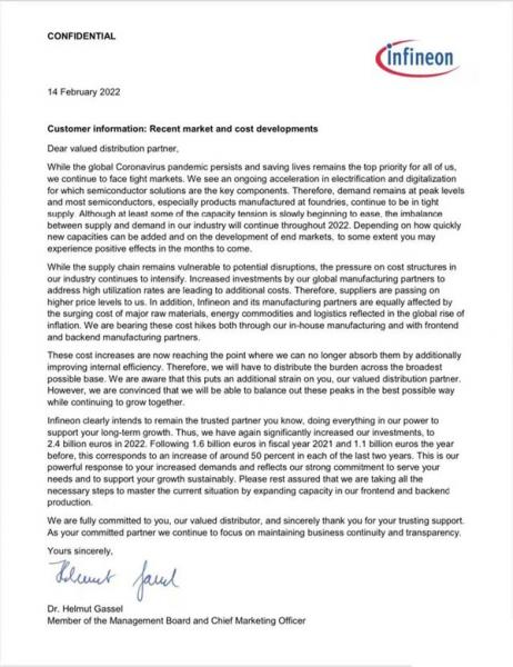 此外,英飛凌及其制造合作伙伴同樣受到全球通脹上升所反映的主要原材料、能源商品和物流成本飆升的影響。英飛凌通過內部制造以及與前端和后端制造合作伙伴共同承擔這些成本上漲。但是,這些成本增加現(xiàn)在已經(jīng)到了英飛凌無法再通過提高內部效率來吸收它們的地步。因此,英飛凌必須在盡可能廣泛的基礎上分配負擔。