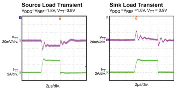 MP20075 的集成分壓器跟蹤參考電壓 (REF),可確保準確的 VTT 和 VTTREF 輸出電壓,而開爾文檢測則有助于實現(xiàn) VTT 的 ±30 mV 和 VTTREF 的 ±18 mV 精度。此外,與大多數(shù) LDO 一樣,純模擬的閉環(huán)拓撲結構對輸出負載的瞬態(tài)響應非?欤恍鑾孜⒚氲臅r間(圖 4)。這種瞬態(tài)響應在高速電路中往往是至關重要的,例如本 LDO 的設計目標:DDR SRAM 端接。