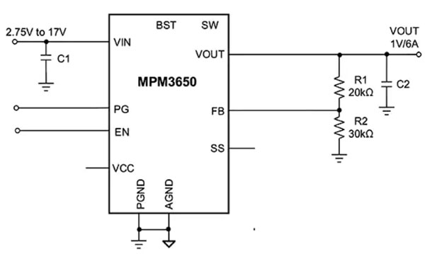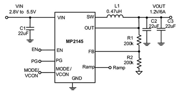 圖 5:MP2145 是一款 5.5 V、6 A 同步降壓開關穩(wěn)壓器,在其 2×3 mm QFN 封裝中含有完整的 20 mΩ 和 12 mΩ MOSFET。(圖片來源:Monolithic Power Systems)