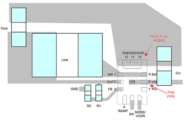 圖 7:MP2145 的輸入電容(此處為 Cin,見右下角;圖 5 原理圖中為 C1)應盡可能靠近第 8 個引腳(電源輸入引腳)和第 10/11/12 個引腳(電源 GND 引腳)。(圖片來源:Monolithic Power Systems)