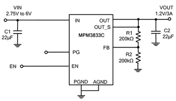 例如,MPM3833C 是一款降壓模塊,內置功率 MOSFET 和一個電感器,能夠在 2.75 V 至 6 V 輸入電壓下提供高達 3 A 的連續(xù)輸出電流,同時具有出色的負載和線路調節(jié)能力(圖 8)。只需反饋電阻、輸入電容和輸出電容即可完成設計。電感器通常是最難指定和放置的外部元器件,但對于模塊來講電感器是內部器件,因此在為了盡量減少電磁干擾 (EMI) 和紋波而需考慮合適的放置位置已不再是一個問題了。