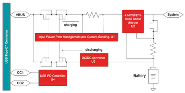 圖 1:USB PD 充電解決方案的內(nèi)部設(shè)計(jì)可能很復(fù)雜,因?yàn)樗仨氝m應(yīng)廣泛變化的電池單元配置和適配器電壓。(圖片來源:Texas Instruments)