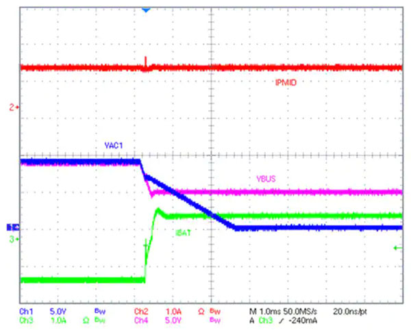 使用備用模式時(shí),充電器會(huì)不斷監(jiān)測 VBUS 電壓。當(dāng) VBUS 下降到閾值水平以下時(shí)(表明失去了來自適配器的輸入),充電器會(huì)迅速從充電模式轉(zhuǎn)變?yōu)?OTG 模式,從電池放電,調(diào)節(jié) VBUS 電壓,并進(jìn)行 FRS,而不需要額外的 DC-DC 轉(zhuǎn)換器。在 BQ25792 中用備用電源模式實(shí)現(xiàn) FRS,可以確保任何連接到 PMID 引腳的配件在 VBUS 電壓下降時(shí)不會(huì)失去電源(圖 3)。
