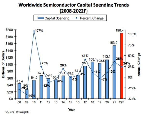 IC Insight日前表示,在 2021 年飆升 36% 之后,預計 2022 年半導體行業(yè)資本支出將繼續(xù)增長 24%,達到 1904 億美元,闖歷史新高,相比2019 年增長 86%。此外,如果資本支出2022年繼續(xù)保持10%以上的增長,將標志著自 1993 年至 1995 年之后,半導體行業(yè)支出首次出現(xiàn)連續(xù)三年保持兩位數(shù)增長的態(tài)勢。