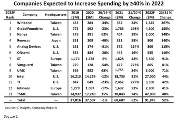 圖 2 顯示了 13 家公司的樣本,這些公司預計今年的資本支出將增加40%以上。這 13 家公司2021年總計投入了 606 億美元,比 2020 年增長了 62%,預計今年將花費 918 億美元,比 2021 年增長 52%。有趣的是,三大內存供應商(即三星、SK 海力士和美光不在名單上,而排名前三的純代工廠(臺積電、聯(lián)電和 GlobalFoundries)則包括在內。此外,前五名領先的模擬 IC 供應商中的四家(TI、Analog Devices、英飛凌和 ST)計劃在 2022 年大幅增加支出。