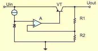 取樣電壓Uin,加在比較器A的同相輸入端,與加在反相輸入端的基準(zhǔn)電壓Uref(Uout*R2/(R1+R2))相比較, 兩者的差值經(jīng)放大器A放大后,Uout=(U+-U-)*A注A為比較放大器的倍數(shù),控制串聯(lián)調(diào)整管的壓降,從而穩(wěn)定輸出電壓。 當(dāng)輸出電壓Uout降低時(shí),基準(zhǔn)電壓Uref與取樣電壓Uin的差值增加,比較放大器輸出的驅(qū)動(dòng)電流增加,串聯(lián)調(diào)整管壓降減小,從而使輸出電壓升高。