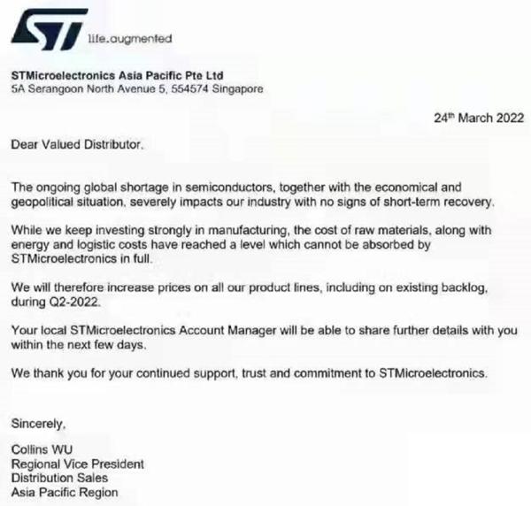 意法半導(dǎo)體在致其分銷合作伙伴的信中說道,不利的經(jīng)濟條件和地理條件使得原材料成本、能源成本和物流成本不斷增加,因此公司已經(jīng)無法消化其總支出,只能選擇漲價。