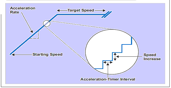 在馬達(dá)啟動(dòng)前不久,便進(jìn)行一次加速速率計(jì)算。負(fù)責(zé)該計(jì)算的軟件,確定加速度定時(shí)器的時(shí)間間隔和增量因數(shù)大小,然后對(duì)各變量進(jìn)行相應(yīng)的配置。同時(shí)使用這些變量,直到對(duì) SPS 速率的修改足以達(dá)到目標(biāo)速度為止。一旦達(dá)到目標(biāo)速度,加速終止。