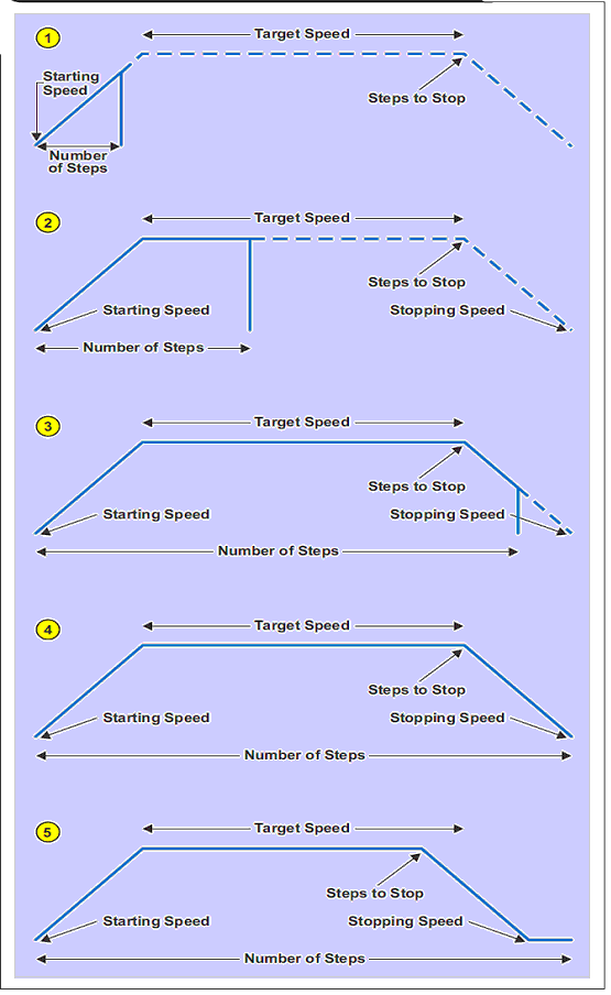 恰好在達(dá)到停止速度時(shí)馬達(dá)停止(情況4)是一種理想情況。在達(dá)到停止速度前不久(情況3)或者以后(情況5)馬達(dá)停止是可以接受的,具體取決于出現(xiàn)這些情況時(shí)距離理想情況還差多少個(gè)步進(jìn)。例如,如果馬達(dá)轉(zhuǎn)動(dòng)過(guò)快時(shí)所有步進(jìn)結(jié)束,則馬達(dá)傳動(dòng)軸可能會(huì)因轉(zhuǎn)動(dòng)慣量而失去位置。但是,如果在所有步進(jìn)執(zhí)行完以前達(dá)到停止速度,則執(zhí)行該次馬達(dá)運(yùn)動(dòng)控制所需的總時(shí)間會(huì)過(guò)長(zhǎng)。