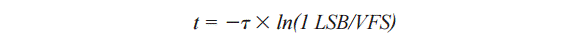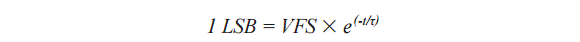 一個(gè)時(shí)間常數(shù)為24 ps或τ = 1/(2 × π × FPBW)。要了解ADC滿量程范圍內(nèi)達(dá)到LSB尺寸要求所需的時(shí)間常數(shù)數(shù)量,就需要找出滿量程誤差或%FS。