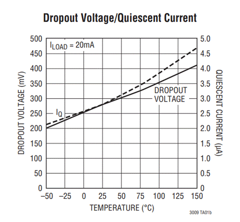 圖1:LT3009壓降與靜態(tài)電流關(guān)系(圖源:ADI)