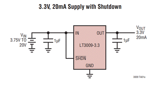 圖2:LT3009典型應(yīng)用電路(圖源:ADI)