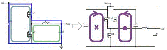 圖3:傳統(tǒng)電流回路拓撲(左)與Silent Switcher拓撲(右)(圖源:ADI)