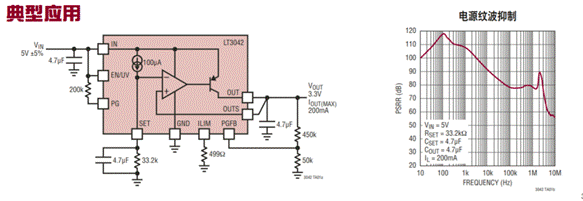 圖8:LT3042的典型應(yīng)用電路(左)和PSRR參數(shù)(右)(圖源:ADI)