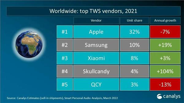2021 年 TWS 耳機全球出貨量達 2.9 億臺,蘋果、三星、小米、Skullcandy、QCY 前五