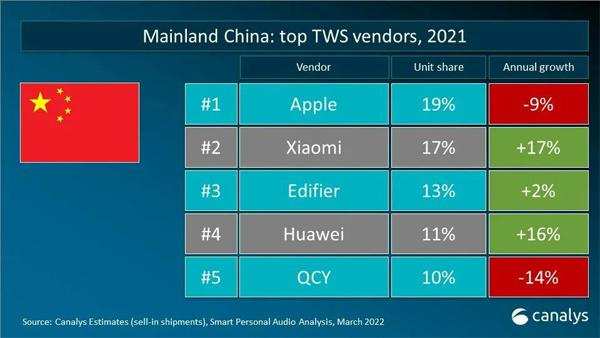中國大陸市場方面,蘋果、小米、漫步者(Edifier)、華為、QCY 位列前五位,市場份額分別為 19%、17%、13%、11%、10%。