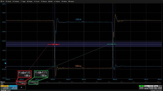 圖 2:初級(jí)空載時(shí)間是通過比較在最大控制器脈沖寬度下、高壓側(cè)和低壓側(cè) FET 的 VGS 轉(zhuǎn)換時(shí)間來測(cè)量的。兩組轉(zhuǎn)換之間的延遲就是空載時(shí)間。在這個(gè)例子中,空載時(shí)間是1.498 ns 和 1.166 ns。(圖片來源:Art Pini)
