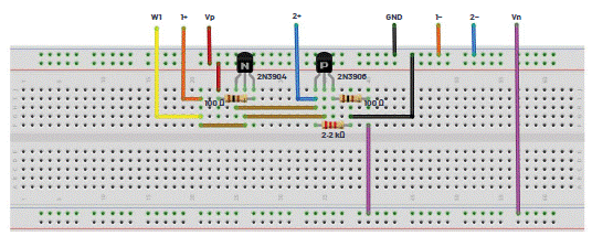 圖9.發(fā)射極跟隨器過零失真消除面包板電路