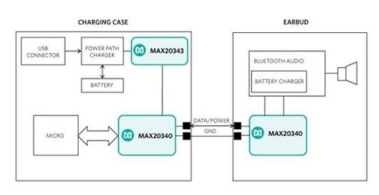 圖4:MAX20340僅需要兩個引腳即可實現(xiàn)耳機和充電盒之間的數(shù)據(jù)和電源傳輸(圖源:Maxim)