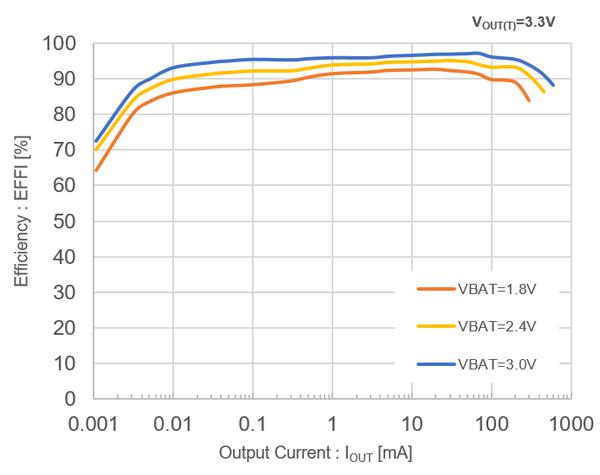 XC9145系列的超低消耗電流電路將電流消耗降低至400nA,同時(shí)采用PWM/PFM控制方式使得產(chǎn)品在輕負(fù)載下顯著提高效率,特別是輸出電流為數(shù)μA時(shí),與傳統(tǒng)DC/DC轉(zhuǎn)換器相比,效率得到大幅提高(圖1)。VIN=2.4V、VOUT=3.3V、IOUT=10μA時(shí)的效率達(dá)到 89.9%,兼容低功耗的MCU和SoC。 無(wú)需復(fù)雜控制,也可以顯著降低恒定升壓工作有較大的系統(tǒng)待機(jī)時(shí)間的 IoT和便攜式設(shè)備的功耗,貢獻(xiàn)于延長(zhǎng)電池使用時(shí)間