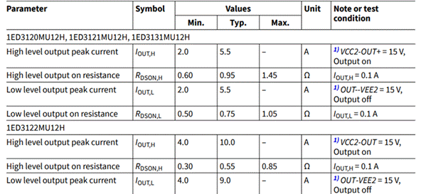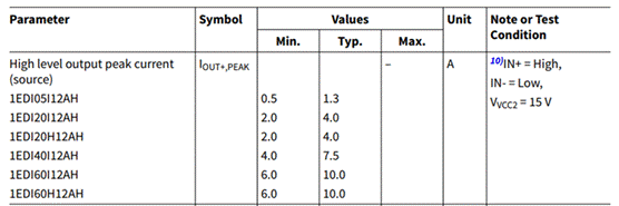 首先來看一下這個(gè)驅(qū)動(dòng)峰值電流的定義方式。這個(gè)很重要,不同公司的產(chǎn)品往往宣傳說法不一樣,所以要參考規(guī)格書。以下圖1是英飛凌的1EDI系列產(chǎn)品的電流表。比如1EDI60I12AH,我們常說它是6A的驅(qū)動(dòng)。事實(shí)上,這個(gè)6A是它的最小值而它的典型值是10A。又比如圖2中的英飛凌新產(chǎn)品1ED3122MU12H,我們稱它為10A的驅(qū)動(dòng),而這個(gè)卻是典型值,但后面的測試條件欄里卻寫著VCC2-OUT=15V,這將是最大值里的典型值。繞口了有沒有?那是不是說明兩者的驅(qū)動(dòng)帶載能力一樣的呢?如果不一樣又有什么差異?