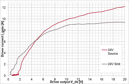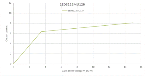 下面我們再來看看新款的X3產(chǎn)品情況怎么樣。英飛凌X3系列的產(chǎn)品的輸出部分直接采用新一代的單獨(dú)的PMOS作為開通輸出級(jí),如圖8所示。而不是像以前的產(chǎn)品那樣使用PMOS與NMOS結(jié)合的方式(如圖5)。選擇1ED3122MU12H產(chǎn)品繪制如圖9的電流能力曲線(根據(jù)設(shè)計(jì)參數(shù)所得而非實(shí)際測量)。按照IGBT標(biāo)稱電流時(shí)的米勒電壓一般為9~10V來看,找到橫坐標(biāo)5、6V的時(shí)候電流能力達(dá)到了6A以上。和之前1EDI60I12AF相當(dāng),如果用最大電流值標(biāo)稱的話就是10A了。由此可以看出和以前PMOS/NMOS結(jié)合的產(chǎn)品峰值電流差不多。但是由于PMOS的輸出不受限于Vgs,不會(huì)像圖7的source電流那樣有2V左右的閾值,而是和sink電流一樣可以直接到零!這樣實(shí)際測的話曲線會(huì)和圖7的sink電流類似,我們暫時(shí)用它假代PMOS的輸出曲線?梢钥吹郊词乖诿桌针娖綍r(shí)兩者的輸出限值一樣都是6A,但是一旦有外加的門極電阻后,PMOS的輸出能力更加出色,如圖7紅色圈所示。