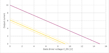 由此可見,單純地給出一個(gè)驅(qū)動(dòng)電流值是無法直接判斷帶載能力的。我們需要更多的信息,比如芯片內(nèi)部末級(jí)輸出形式、定義值的點(diǎn)在哪?更為重要的是,功率器件的門極電阻影響極大。如果外部電阻很大的話,會(huì)分掉更多的壓降,體現(xiàn)在圖7的電阻斜率更小,使得工作點(diǎn)左移,更近原點(diǎn)。如果這時(shí)候還看15V的電流能力就變得毫無意義了。而使用獨(dú)立的、電流更大的PMOS,可以解決NMOS作為共漏極輸出所需要的門檻電壓問題,輸出特性線整體左移,疊加外電阻影響后,實(shí)際可以獲得更高的電流。