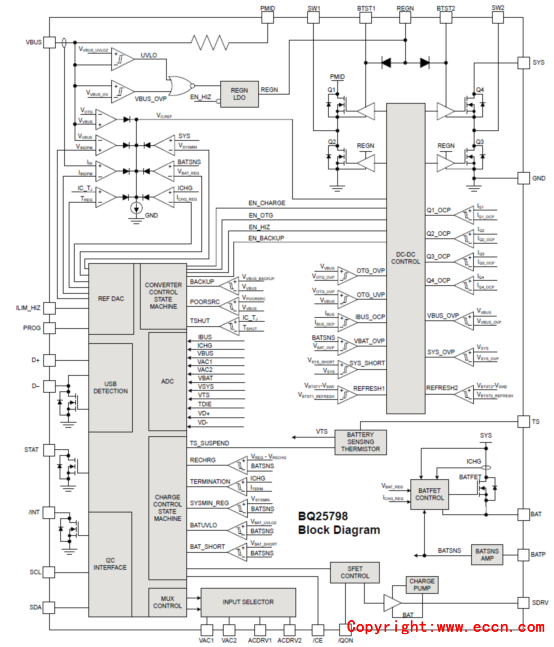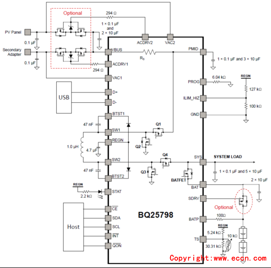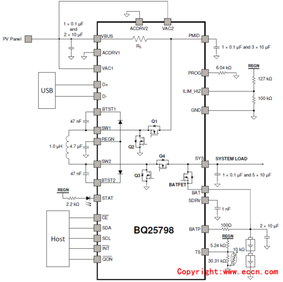 圖3. BQ25798應(yīng)用框圖:單輸入源和無FET