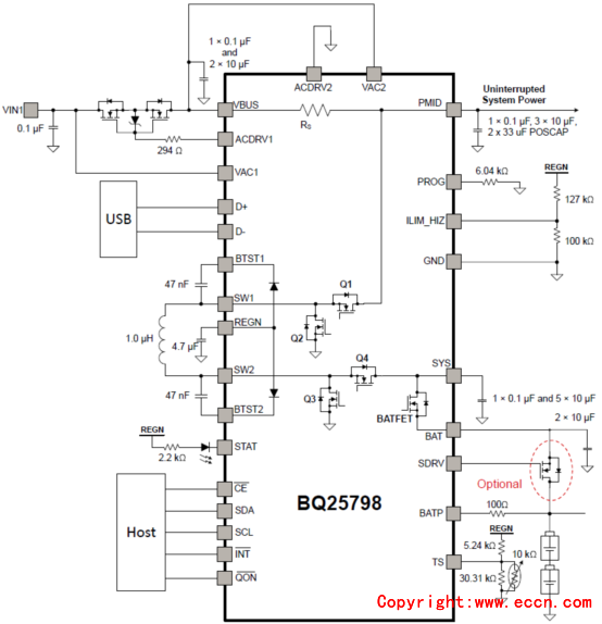 圖5. BQ25798應(yīng)用框圖:單輸入源,備份模式和有FET