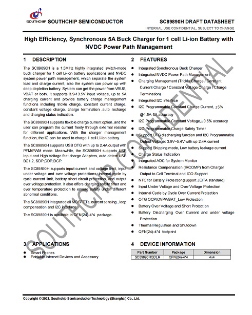 南芯SC89890H芯片支持3.9V至14V寬輸入電壓;支持BC1.2檢測及可調高壓適配器,同時具備適配器最大功率自動跟蹤功能以及VINDPM支持電池電壓自動跟蹤。