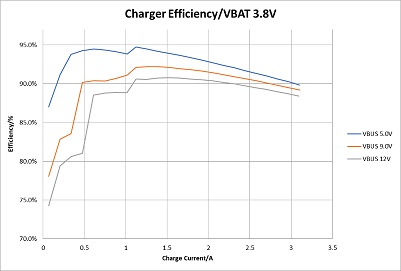 此外通過效率曲線可以看到,當以9V或者12V輸入時,其中1-3A充電電流范圍內,效率均保持在87%以上;而對于常見的9V2A、12V1.5A的快充狀態(tài),轉換效率均在90%以上。