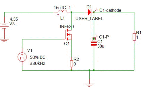 在圖 3中,升壓轉換器電源系統(tǒng)由經典的 MOSFET-二極管-電感器組合表示。MOSFET 以 50% 的占空比進行開關,輸入電壓源 V3 設置為產生