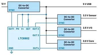 圖3顯示了圖1中采用LTC6902多相振蕩器的電源架構(gòu)。它由5 V電壓供電。該電壓由一個(gè)將12 V轉(zhuǎn)換為5 V的降壓轉(zhuǎn)換器產(chǎn)生。對于開關(guān)穩(wěn)壓器,如果它們首先使用自己的內(nèi)部振蕩器獨(dú)立啟動(dòng),然后再提供外部時(shí)鐘,則一般不會(huì)有問題。詳細(xì)信息可在相應(yīng)開關(guān)穩(wěn)壓器的數(shù)據(jù)手冊中找到。