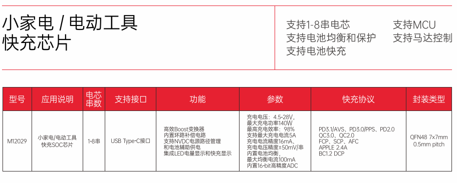 針對(duì)電動(dòng)工具和小家電市場(chǎng),水芯推出了M12029快充SOC芯片,支持1-8串電芯,集成高效Boost變換器,支持NVDC電源路徑管理和電池輔助供電,支持馬達(dá)控制,支持MCU,內(nèi)置環(huán)路補(bǔ)償電路,集成LED電量顯示和快充顯示。