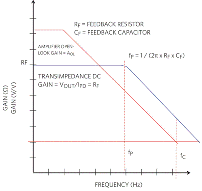 在圖 2 中,信號在放大器的反相側(cè)獲得。TIA 的直流增益等于 V OUT /I PD。方便的是,該增益等于反饋電阻 R F。隨著頻率的增加,增益保持穩(wěn)定,直到達到拐角頻率,其中 R F和 C F形成一個低通濾波器。