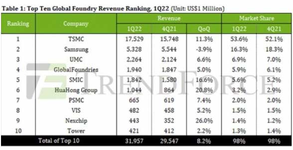 市場(chǎng)研究公司 TrendForce 公布了 2022 年一季度全球十大晶圓代工企業(yè)收入排行榜,臺(tái)積電繼續(xù)霸榜,并且進(jìn)一步擴(kuò)大了領(lǐng)先優(yōu)勢(shì)。