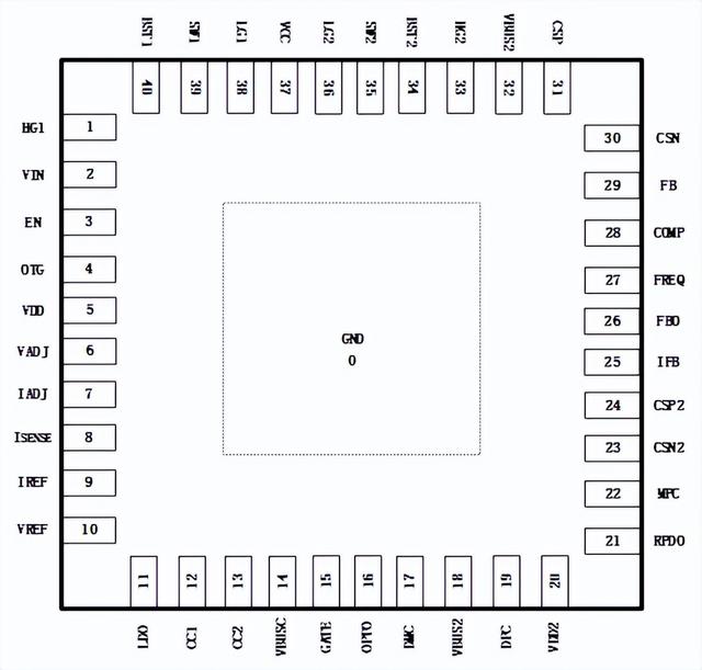 LYF63303 采用 QFN5x5-40 封裝,引腳圖如上圖所示。支持可編程軟啟動,有效限制啟動時浪涌,內(nèi)置抖頻技術(shù),有效降低EMI干擾。支持輸入欠壓保護、輸出過壓保護、逐周期限流保護、輸出過流/短路保護、過溫保護等多重保護功能。