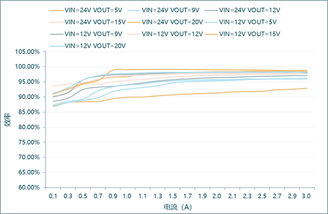 寶礫微 60W PD電源Demo 在不同輸入和輸出條件下的效率曲線測試如上圖所示。LYF63303內(nèi)置2A驅(qū)動電路,使得整體效率非常高,最高可達99.14%,非常適合小體積的應(yīng)用,同時自帶恒溫環(huán),從而提高產(chǎn)品的可靠性。
