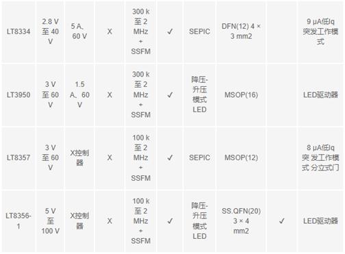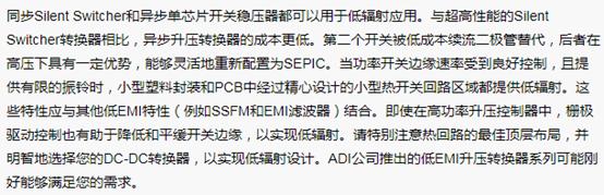 MHz和SSFM,能提供低輻射。EVAL-LT8357-AZ升壓控制器可以實現(xiàn)相似的性能。有關(guān)這些器件的完整輻射結(jié)果、原理圖和測試選項,可以訪問analog.com,查看對應(yīng)的產(chǎn)品登錄頁面。表1列出了一個新的低EMI異步升壓和SEPIC轉(zhuǎn)換器系列。單芯片IC和控制器IC結(jié)構(gòu)簡單、成本低,采用多種拓?fù),具有大功率功能和低輻射,因此非常實用。?dāng)超低輻射成為首要的要求時,也可以使用高電流Silent