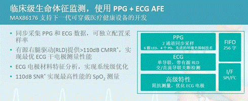在醫(yī)院測量心電圖(ECG)時,通常采用濕電極采集心電信號,濕電極在使用過程中需要涂上膏狀導電膠,因而得名濕電極,由于導電膠很容易干掉而影響測量結(jié)果,因而該方法不適合非專業(yè)人士操作,也不利于心電信號長期監(jiān)測。干電極的出現(xiàn)讓可穿戴設備實現(xiàn)心電測量功能成為可能,但在干電極采集法中,皮膚與電極之間的接觸導電性比濕電極低,且干電極對運動偽影更敏感,易導致讀數(shù)不精確。MAX86176的ECG通道符合移動心電圖設備國際標準IEC 60601-2-47要求,該通道內(nèi)置高精度ADC,采用全差分輸入結(jié)構(gòu),在電力線頻率下共模抑制比超過110dB,完全具備支持干電極ECG應用的能力,F(xiàn)在,該芯片在單導聯(lián)監(jiān)護儀、單導聯(lián)無線貼片和胸帶心率監(jiān)測儀中已得到廣泛應用。