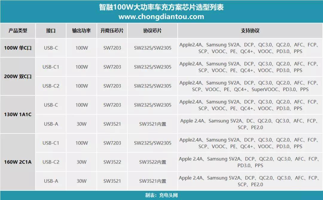 針對于大功率多口獨立快充車充市場,無論是單口100W還是雙口盲插,也無論是130W雙口獨立快充,還是160W三口獨立快充,智融都可以提供全套芯片,并且實現全協(xié)議快充以及精簡的外圍電路。